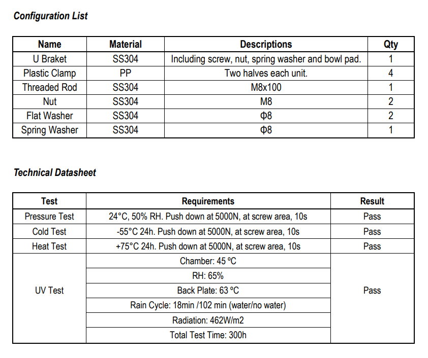 Las partes metálicas de la abrazadera de cable están hechas de acero inoxidable y las partes de plástico están hechas de polipropileno mejorado (PP). El PP mejorado es para mejorar las propiedades de retardo de llama, resistencia al calor, resistencia a la temperatura, estabilidad dimensional y rigidez.